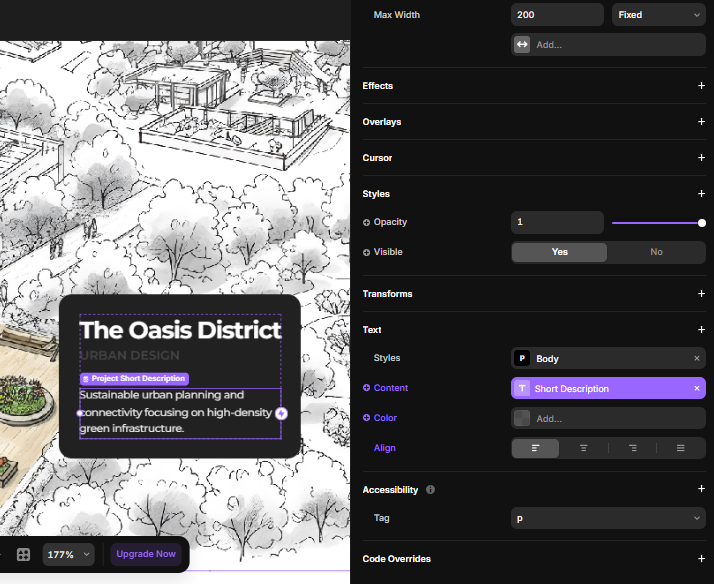 - Map your CMS: In the Component properties, link the Text Field to your CMS collection to populate the popups automatically.